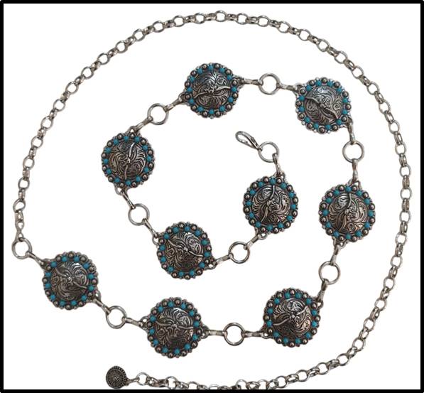 Cinto de Medalhas Long Horn com bolinhas turquesa nas laterais. Ajustável. Pingente na ponta. TAMANHO ÚNICO.