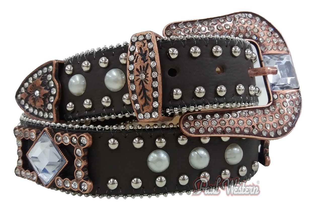 Cinto de Couro Legítimo Paul Western. Acompanha margaridas com pedras e strass. Garrinhas de metal nas laterais e pérolas nos centros.