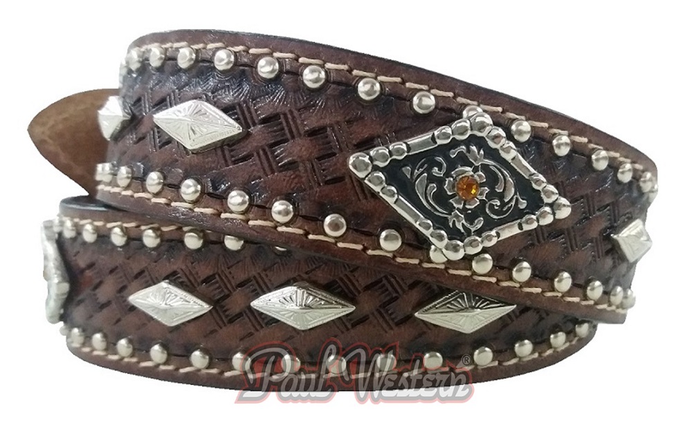 Cinto de Couro Legítimo Paul Western. Corpo Balaiado, com garrinhas de metais nas laterais, margaridas no corpo do cinto que acompanha strass.