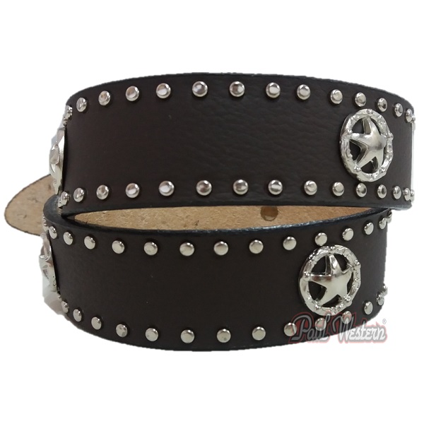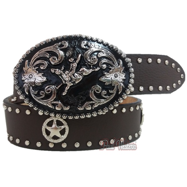 Cinto de Couro Legítimo Paul Western. Infantil. Garrinhas de metal nas laterais. Margaridas de estrela. Fivela em Níquel com fundo preto.