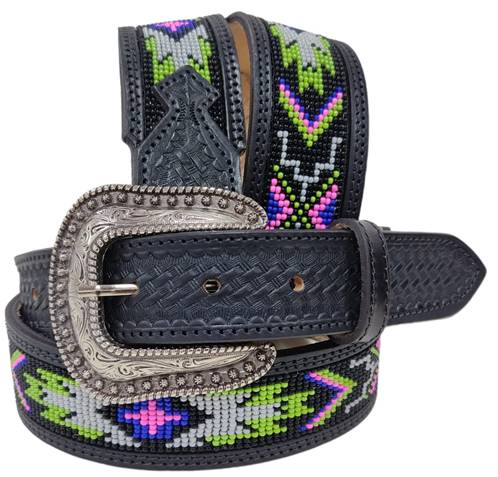 Cinto de Couro Legítimo Paul Western. Miçangas coloridas trançadas á mão.