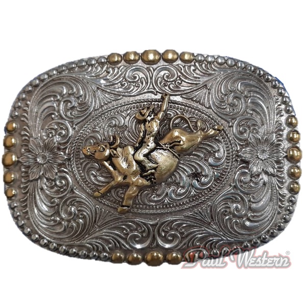Fivela em Desenhos de Flores. Níquel e Dourada. Boi e Peão no Centro.