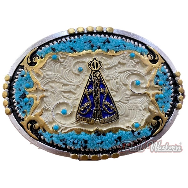 Fivela Oval Níquel Nossa Senhora com Detalhes em Dourado. Pedra Azul Batida. Fundo Bege.